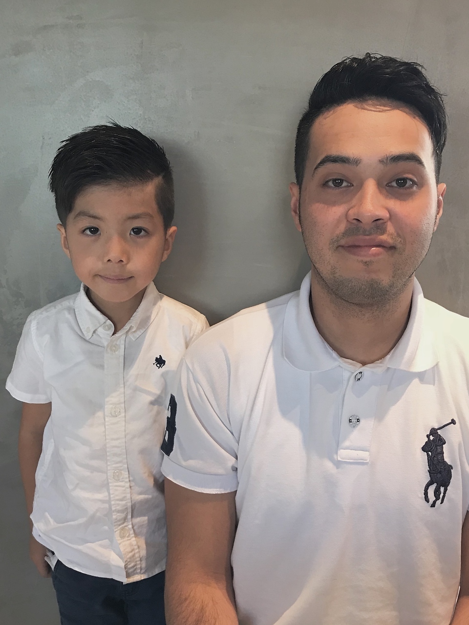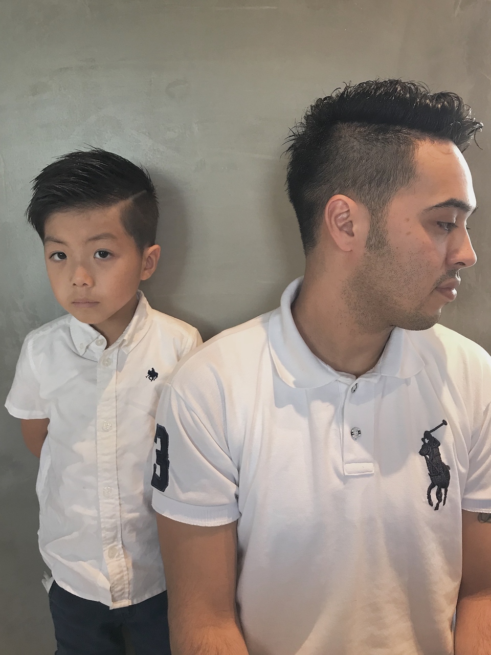 親子でオシャレスタイル楽しみましょう。キッズの方のスタイルは、少し刈り込みを入れて、より外国のバーバースタイルにしています。お父さんはしっかり刈り上げスキンフェードにして、トップは七三も遊ばせもありの2ウェイスタイル。ハードパート入り。
