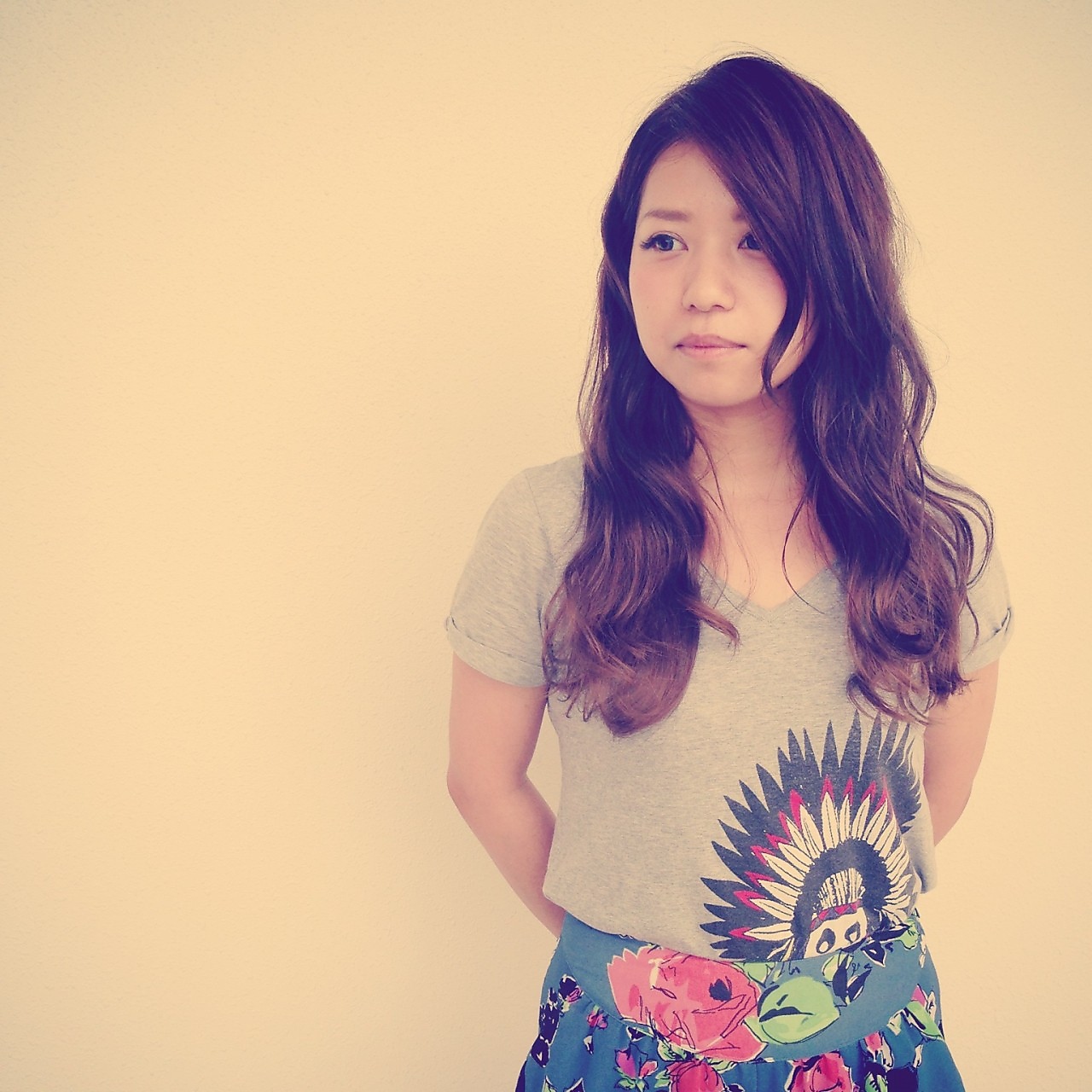 Aラインに波うつシルエットがリラックスな雰囲気で、ガーリーなパーマスタイル。アッシュ系のヌーディーベージュカラーで、外国人バランスに。